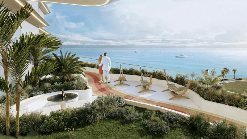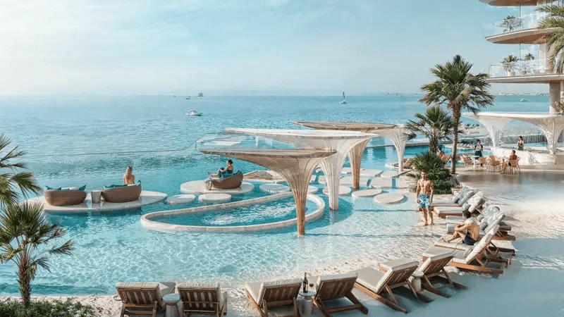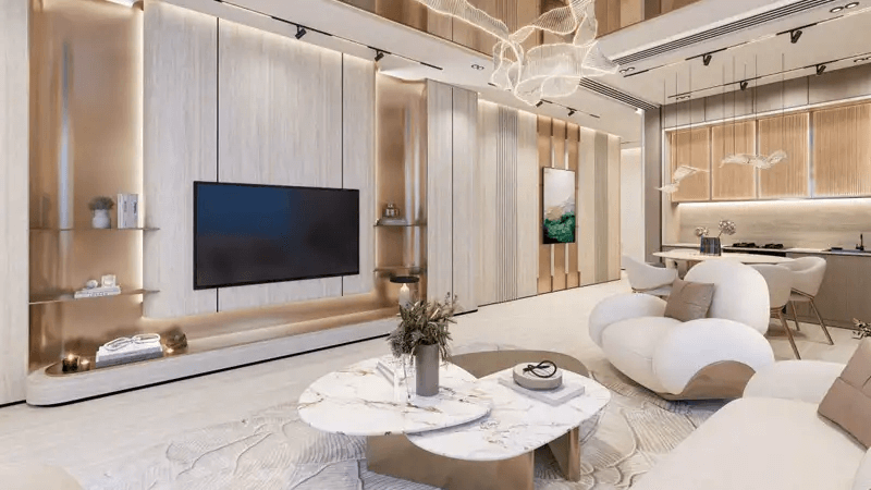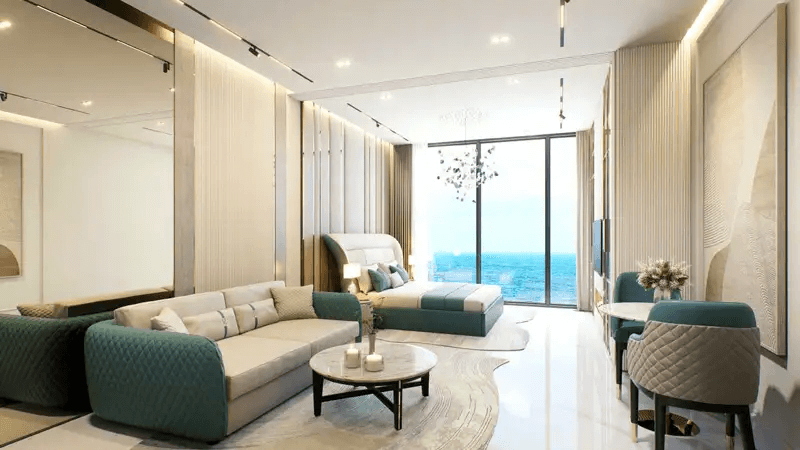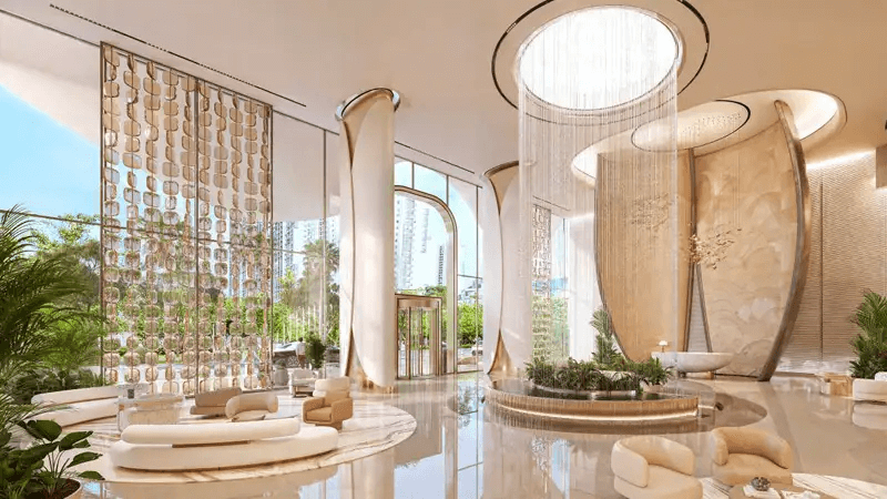 In terms of architecture, this is the tower with the panorama concept, where each day is renewed. Every elevation serves as a view of the sunrise and sunset thanks to the design’s emphasis on unbroken 360-degree sea views and the stacking of terraces and living platforms. The tower’s public spaces are intentionally theatrical, with an aquarium in the big lobby that welcomes residents, an atrium with a waterfall that simulates the tides, and intricately designed lifting lobbies that set the tone for the house inside. The ground plane transforms into a network of landscaped pathways, cafes, and open-air recreation areas that blur the boundaries between interior and outdoor life as a result of the building’s relationship to the promenade.
