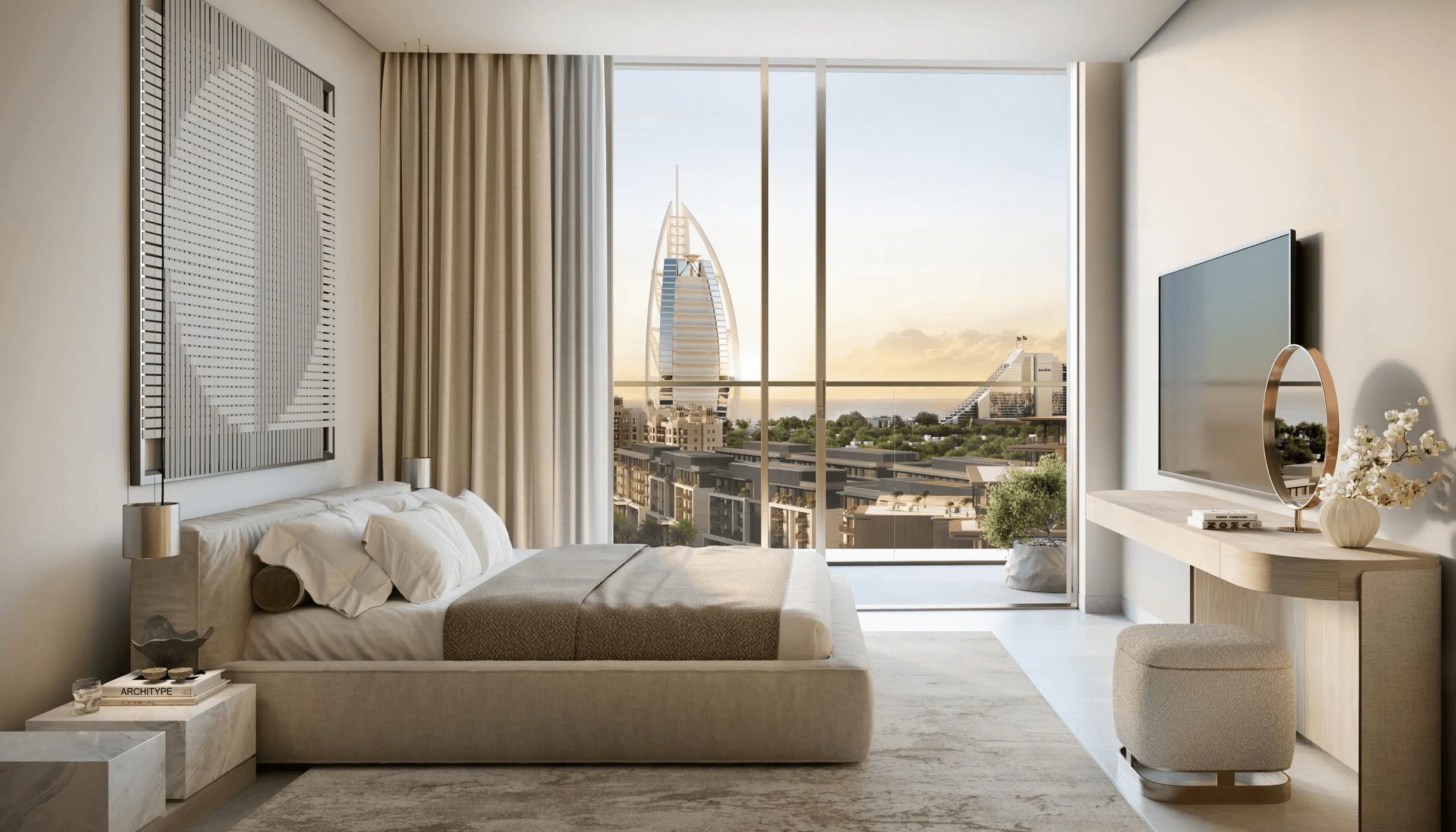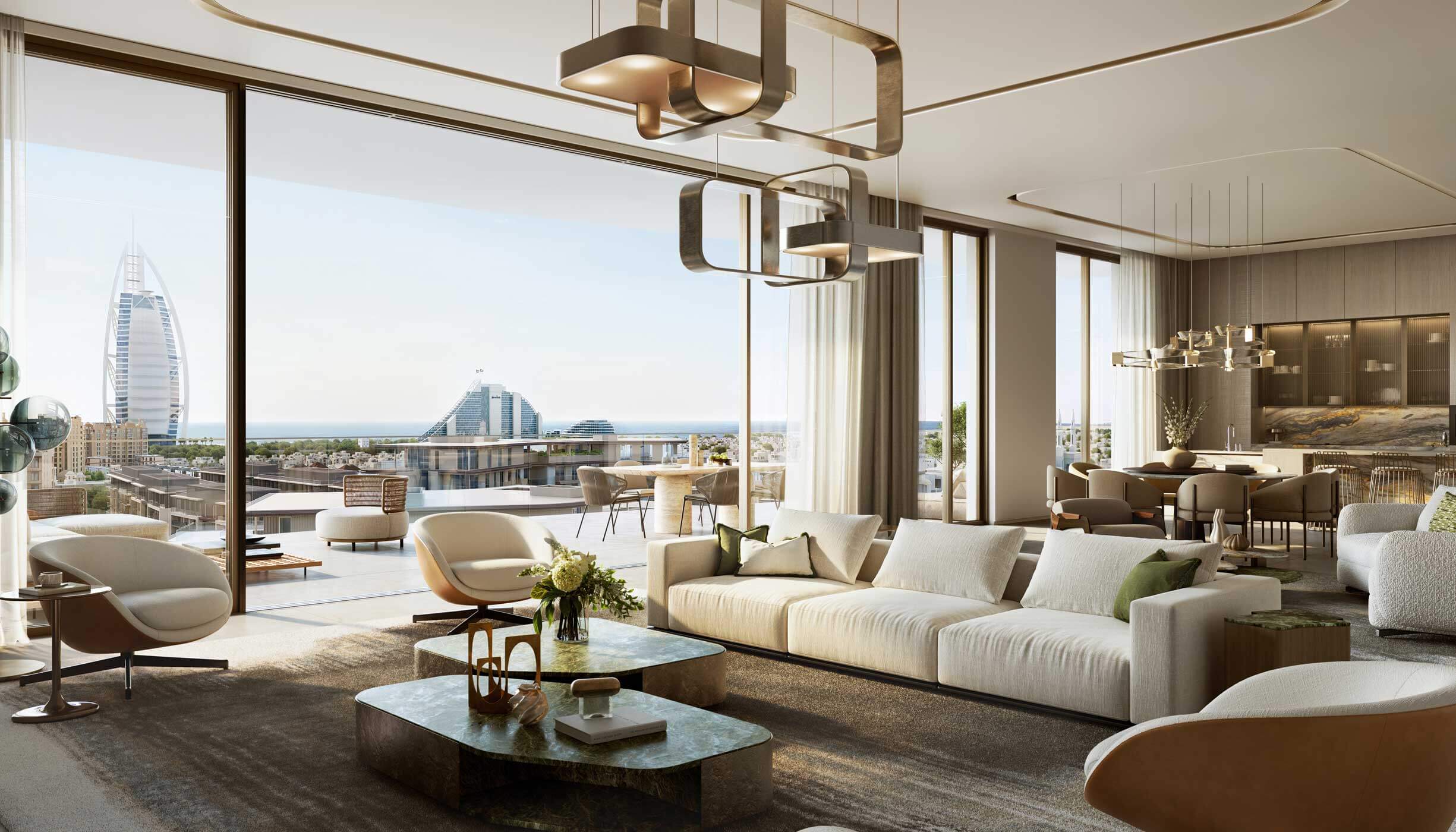 With open living spaces designed for both peaceful relaxation and family gatherings, each apartment is lavishly large and bright with natural light. For smooth movement and a feeling of hassle-free openness, the kitchens, dining area, and living rooms are all integrated. Every bedroom has an ensuite for comfortable seclusion and relaxation, and a balcony offers the perfect place to relax and take in the beautiful surroundings. The four-bedroom apartments that are atop these structures are the pinnacle of refinement, providing breathtaking, useful, and tranquil rooms. Each apartment boasts open-plan living areas that extend to a large terrace with unobstructed views of the Burj Al Arab and the contemporary skyline, thriving in exclusivity and exquisite craftsmanship.