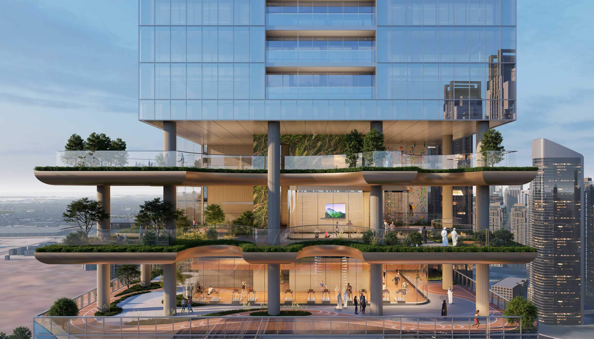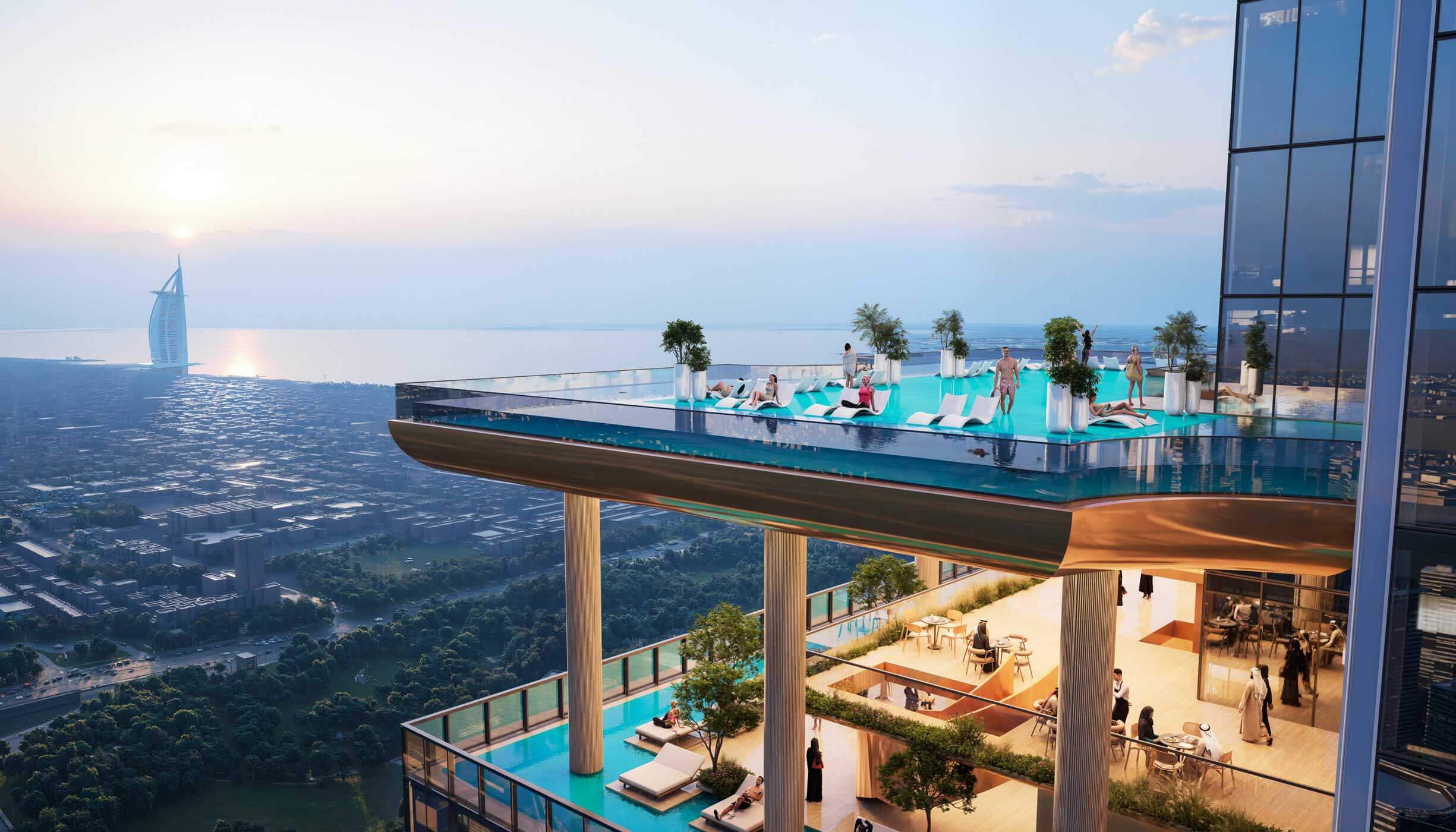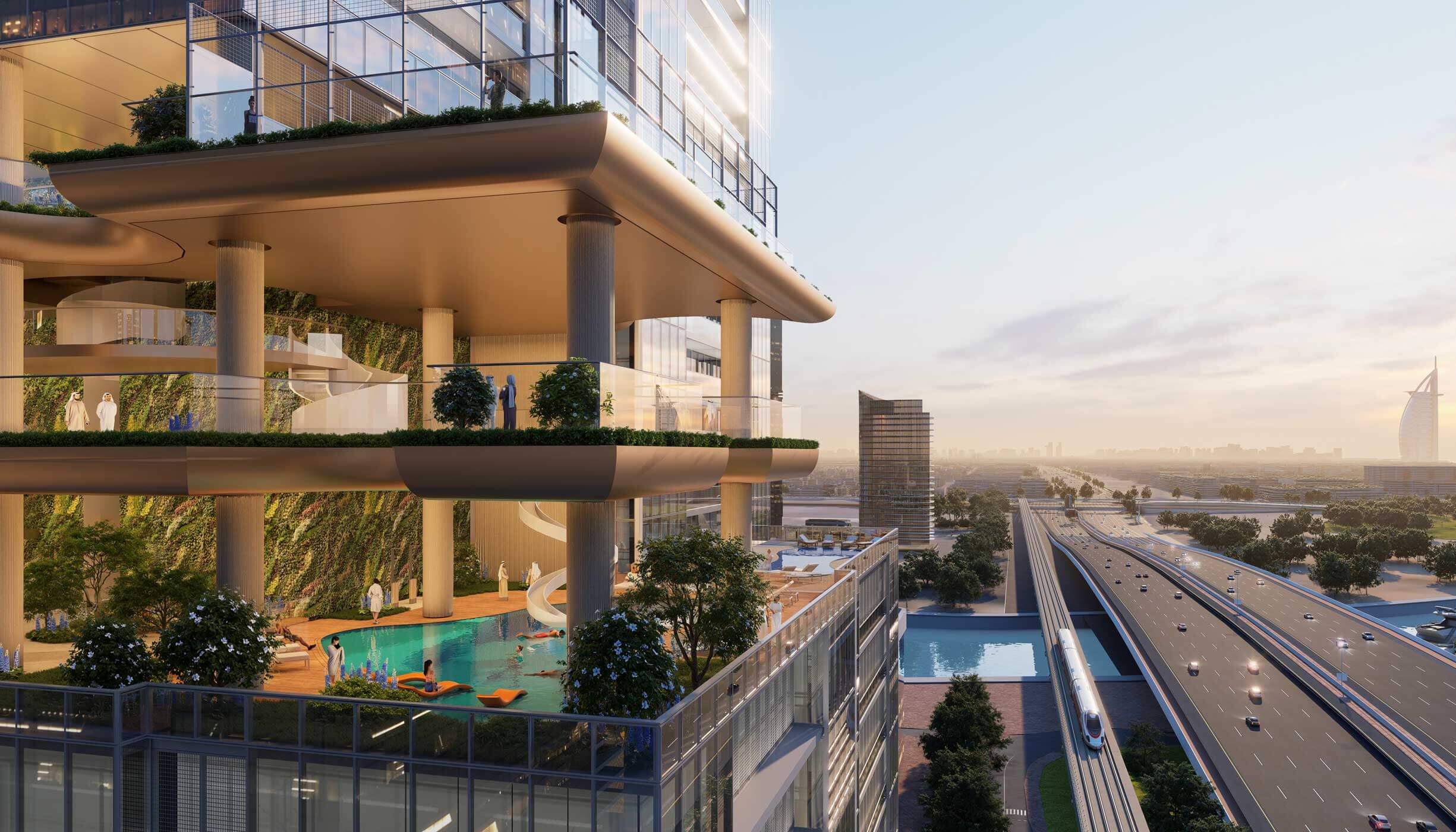 Residents enjoy more than 30 amenities across four themed SkyParks, including infinity pools, gyms, yoga decks, gardens, family areas, cinemas, and lounges, all with panoramic city and canal views.